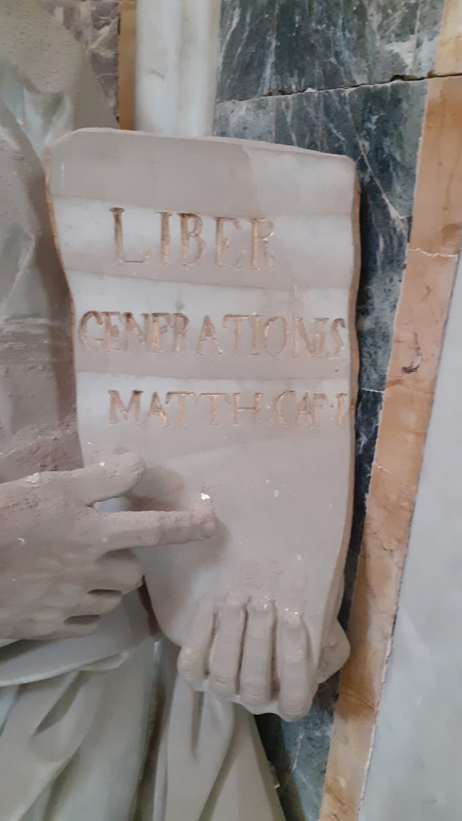 - ISCRIZIONI sul vangelo tra le mani del Santo evangelista - LIBER/GENERATIONIS/MATTH.CAP.I - Giovan Battista Marino - capitale -