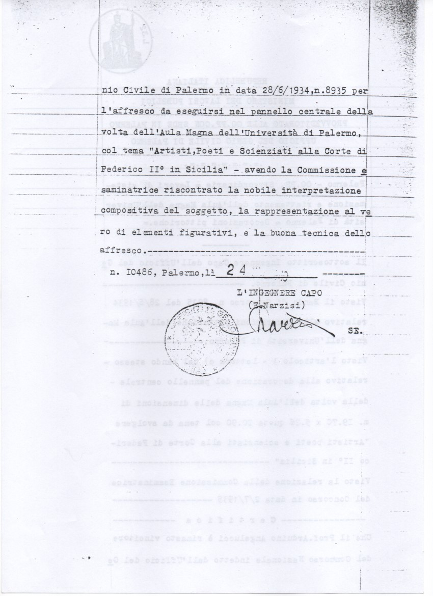 cartoni realizzati in proporzione 1:1, per l'affresco eseguito, tra il 1935 e il 1938, dall'artista reatino nella volta dell'allora Aula Magna della R. Università di Palermo sita al Complesso dei Teatini. I disegni preparatori sono in totale 15 divisi in 4 scene. La scena 2 è composta da 3 parti