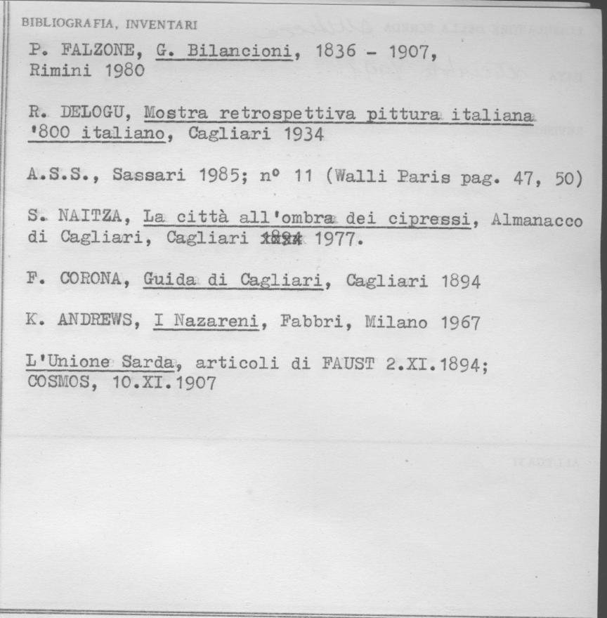 - NOTIZIE STORICO CRITICHE Il dipinto, certamente uno dei più interessanti del Cimitero, è opera del Bilancioni, vissuto a Cagliari per diverso tempo. Nel 1885 decorò la cupola della chiesa di S.Antonio a Cagliari e, successivamente, i palazzi Zamberletti a Cagliari e Giordano a Sassari. Apprezzato sopratutto come ritrattista della borghesia cagliaritana, di cui rifletteva i gusti conservatori in arte, si espresse con un linguaggio purista con riferimenti alla pittura dei Nazareni, riscontrabili nella severa impalcatura rocciosa dello sfondo, nel disegno preciso e lineare, nell'economia della composizione. Il soggetto è affrontato con efficace rigore drammatico definito nella stampa locale "bello ed arduo stimolo ai più forti pennelli"((Faust 1894). Per un confronto si veda tra l'altrol'opera del contemporaneo Alessandro Franchi (affreschi del duomo di Prato)