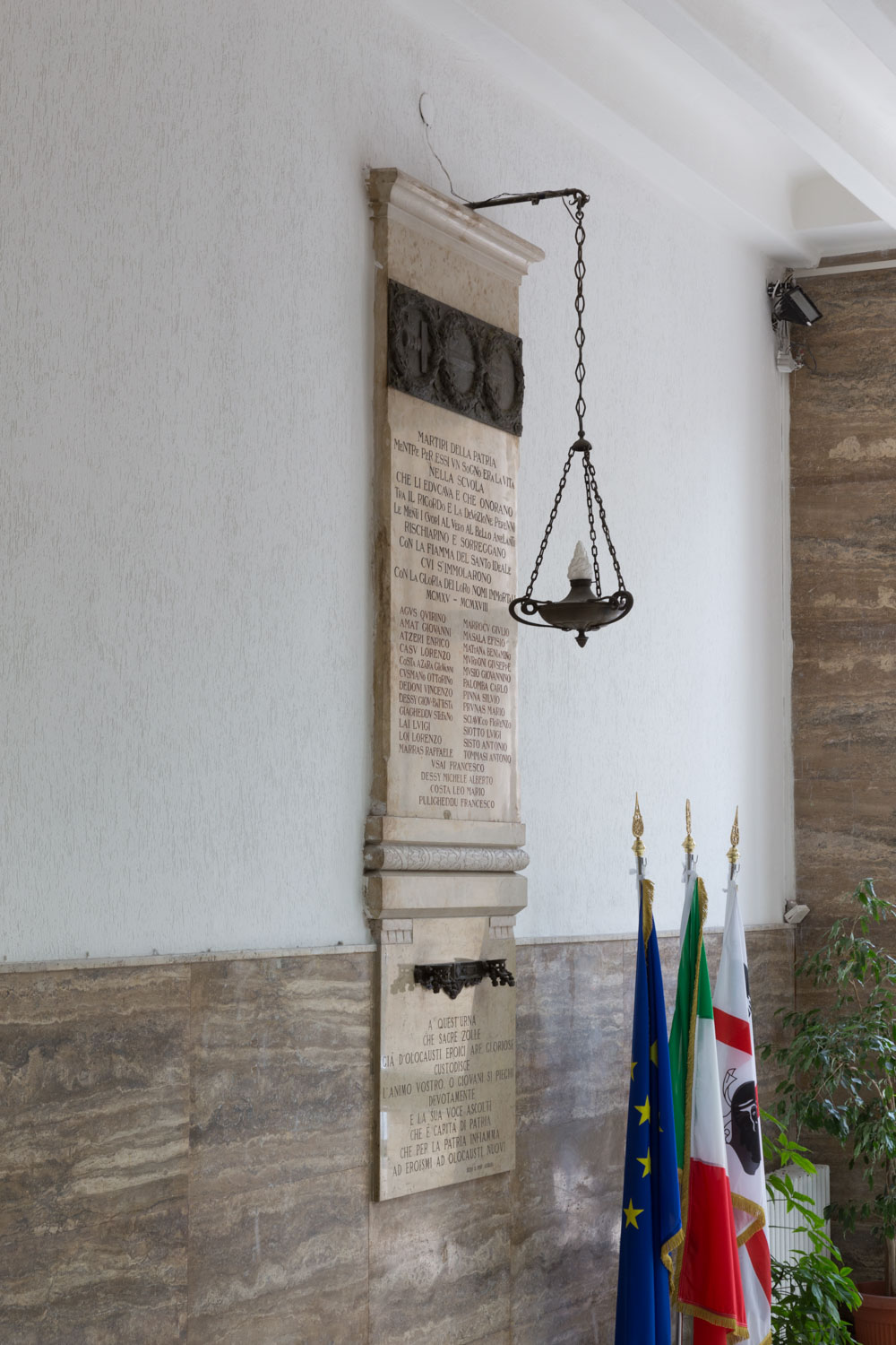 - ISCRIZIONI nel campo - MARTIRI DELLA PATRIA/ MENTRE PER ESSI VN SOGNO ERA LA VITA/ NELLA SCVOLA/ CHE LI EDVCAVA E CHE ONORANO/ TRA IL RICORDO E LA DEVOZIONE PERENNI/ LE MENTI I CVORI AL VERO AL BELLO ANELANTI/ RISCHIARINO E SORREGGANO/ CON LA FIAMMA DEL SANTO IDEALE/ CVI S’IMMOLARONO/ CON LA GLORIA DEI LORO NOMI IMMORTALI/ MCMXV – MCMXVIII// AGVS QUIRINO/ AMAT GIOVANNI/ ATZERI ENRICO/ CASV LORENZO/ COSTA AZARA GIOVANNI/ CVSMANO OTTORINO/ DEDONI VINCENZO/ DESSI’ GIOV.BATTISTA/ GIAGHEDDV STEFANO/ LAI LVIGI/ LOI LORENZO/ MARRAS RAFFAELE/ MARROCV GIVLIO/ MASALA EFISIO/ MATTANA BENIAMINO/ MVRRONI GIVSEPPE/ MVSIO GIOVANNINO/ PALOMBA CARLO/ PINNA SILVIO/ PRVNAS MARIO/ SCIAVICCO FIORENZO/ SIOTTO LVIGI/ SISTO ANTONIO/ TOMMASI ANTONIO/ VSAI FRANCESCO/ DESSY MICHELE ALBERTO/ COSTA LEO MARIO/ PULIGHEDDU FRANCESCO// A QUEST’URNA/ CHE SACRE ZOLLE/ GIA’ D’OLOCAUSTI EROICI ARE GLORIOSE/ CUSTODISCE/ L’ANIMO VOSTRO O GIOVANI SI PIEGHI/ DEVOTAMENTE/ E LA SUA VOCE ASCOLTI/ CHE E’ CARITA’ DI PATRIA/ CHE PER LA PATRIA INFIAMMA/ AD EROISMI AD OLOCAUSTI NUOVI/ DETTO' IL PROF. AZZOLINA - capitale alto-basso -