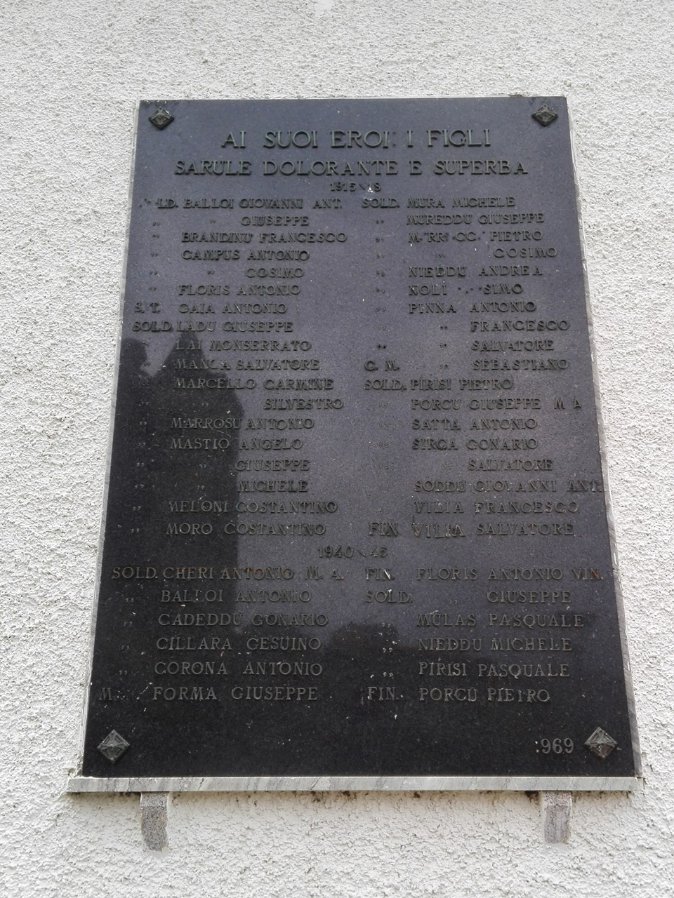 - ISCRIZIONI sul corpo della lapide - AI SUOI EROI E FIGLI/ SARULE DOLORANTE E SUPERBA/ 1915-18/ [..]LD. BALLOI GIOVANNI ANT./ SOLD.BALLOI GIUSEPPE/ SOLD. BANDINU FRANCESCO/ SOLD.CAMPUS ANTONIO/ SOLD.CAMPUS COSIMO/ SOLD.FLORIS ANTONIO/ S.T. GAIA ANTONIO/ SOLD.LADU GIUSEPPE/ SOLD.LAI MONSERRATO/ SOLD.MANCA SALVATORE/ SOLD MARCELLO CARMINE/ SOLD.MARCELLO SILVESTRO/ SOLD.MARROSU ANTONIO/ SOLD.MASTIO ANGELO/ SOLD.MASTIO GIUSEPPE/ SOLD.MASTIO MICHELE/ SOLD.MELONI COSTANTINO/ SOLD.MORO COSTANTINO/ SOLD.MURA MICHELE/ SOLD.MUREDDU GIUSEPPE/ SOLD.M[.]RR[.]CC[.] PIETRO/ SOLD. M[.]RR[.]CC[.] COSIMO/ SOLD. NIEDDU ANDREA/SOLD. NOLI [..]SIMO/ SOLD. PINNA ANTONIO/ SOLD. PINNA FRANCESCO/ SOLD.PINNA SALVATORE/ C.M.PINNA SEBASTIANO/ SOLD.PIRISI PIETRO/ SOLD.PORCU GIUSEPPE MA/ SOLD.SATTA ANTONIO/ SOLD.SIRCA GONARIO/ SOLD.SIRCA SALVATORE/ SOLD.SODDU GIOVANNI ANT./ SOLD.VILIA FRANCESCO/ FIN VILIA SALVATORE - maiuscolo -