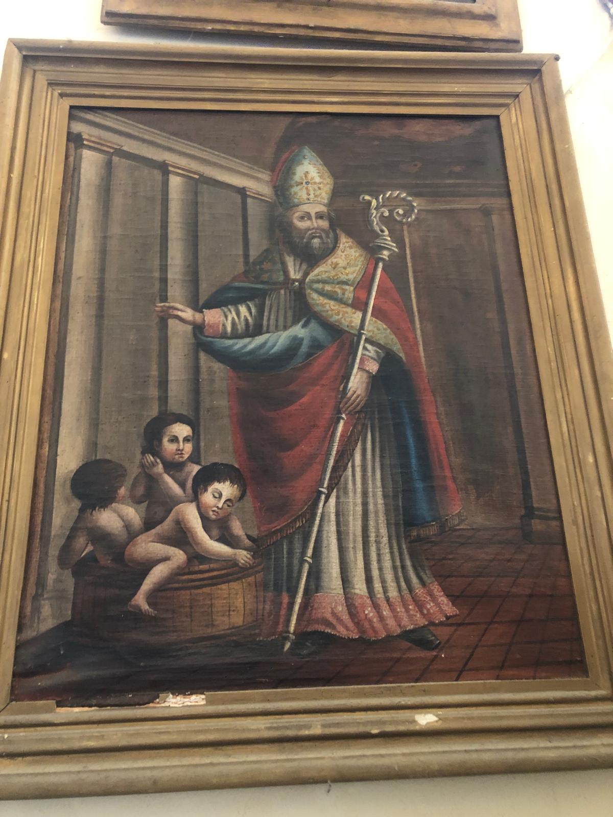 - NOTIZIE STORICO CRITICHE Il pittore raffigura l’evento miracoloso in cui San Nicola di Bari resuscita tre bambini che erano stati uccisi e messi sotto sale con altra carne, dentro una botte. L'anonimo pittore, di ambito locale, mostra un linguaggio pittorico ingenuo, sia nella rappresentazione anatomica delle figure - il santo e i tre fanciulli - che nella realizzazione della fuga prospettica del pavimento e nella rappresentazione spaziale dell'ambientazione, un muro contraddistinto da una serie di lesene con cornicione modanato su cui si imposta una volta a botte. Una copia dell'opera è custodita nella chiesa di San Michele ad Alghero (si veda la scheda NCTN 20-00042478)