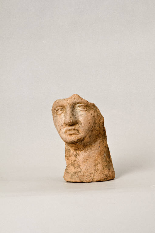 Testa maschile realizzata in terracotta.\nArgilla nocciola con inclusi micacei e tracce d'ingobbio