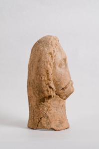 Testa femminile realizzata in terracotta. \nArgilla nocciola con inclusi neri, poco depurata.