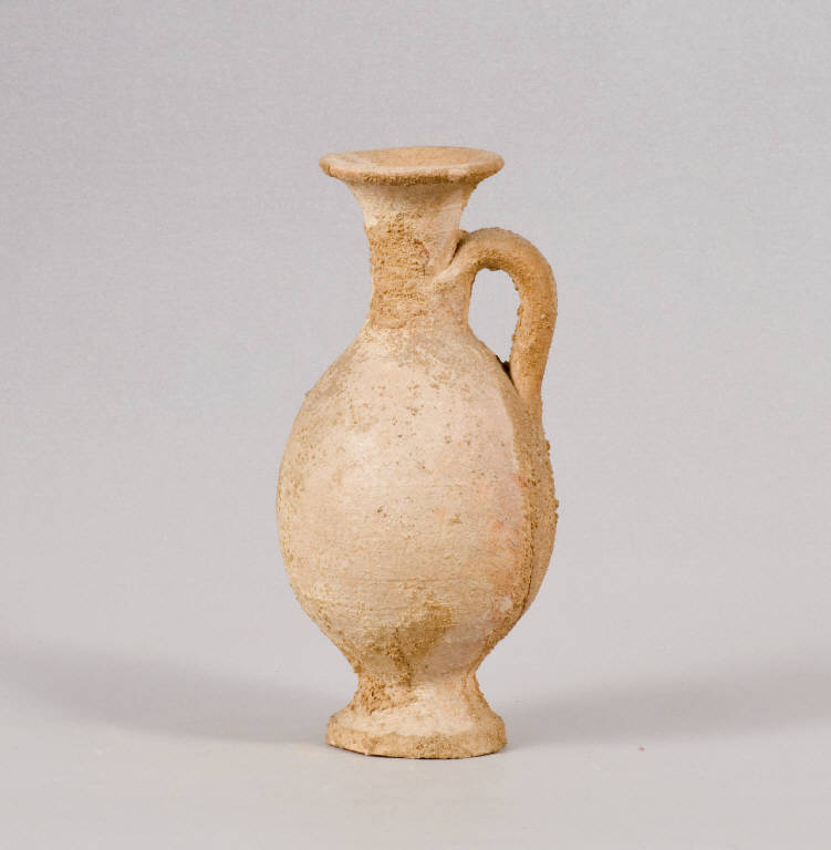 Argilla nocciola chiaro.\nLabbro estroflesso, orlo arrotondato; collo a profilo concavo; corpo globulare; piede campanulato, fondo piatto. Ansa a nastro impostata verticalmente sul collo e sul corpo.