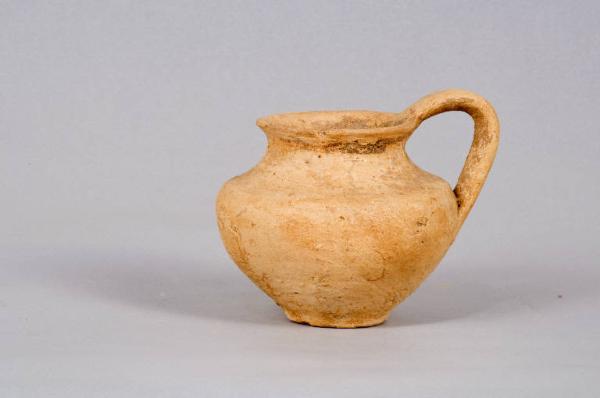 Corpo ceramico nocciola.\nLabbro estroflesso, collo a profilo concavo; corpo piriforme, piede a disco. Ansa a nastro impostata verticalmente sull'orlo e sul corpo. \nSpesse linee nere, oggi quasi del tutto evanide, decoravano il collo.