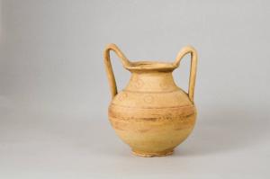 olla carenata ad anse rimontanti messapica.\nArgilla beige; decorazione in rosso e bruno. Il fondo del piede presenta ingobbio bianco.\nLabbro estroflesso; collo a profilo concavo; corpo globulare; piede ad anello con fondo piatto. Anse a nastro sormontanti, impostate verticalmente sull'orlo e sul corpo.