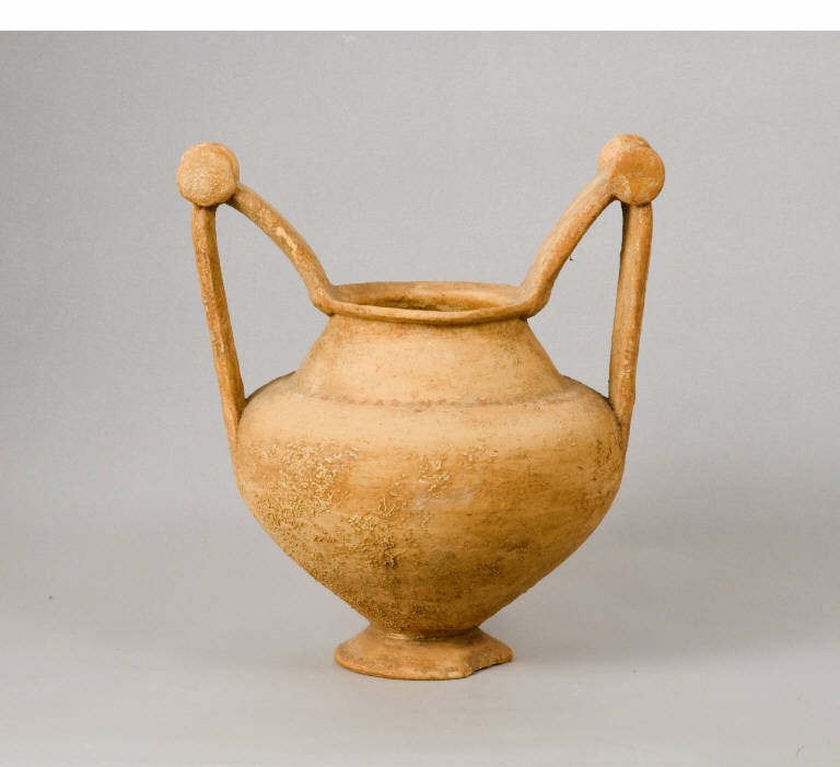 Argilla nocciola.\nLabbro estroflesso, collo troncoconico, spalla arrotondata, corpo globoso, piede campanulato. Anse verticali a cui si innestano anse oblique: trozze decorative applicate.