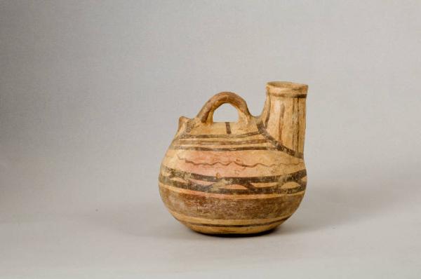 Corpo ceramico beige rosato, fiammata di cottura sul corpo; decorazione in bruno e paonazzo.\nBocchello verticale cilindrico, corpo otriforme, apicatura posteriore, fondo piatto; ansa a bastoncello impostata longitudinalmente sul corpo.
