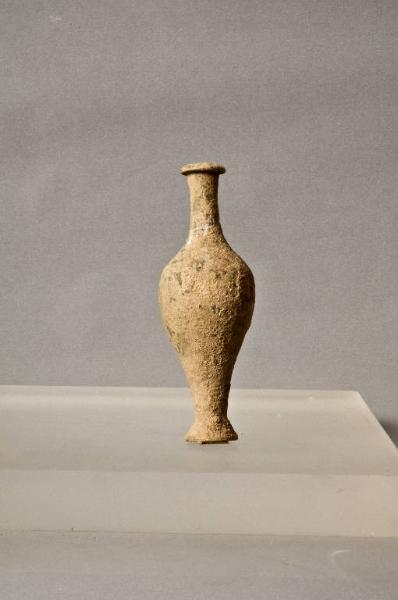 Argilla nocciola, vernice rosso-marrone.\nOrlo ingrossato ad anello sbilenco, collo tubolare, corpo fusiforme; piede tronconico, fondo piatto. \nVerniciato l'orlo e il collo.