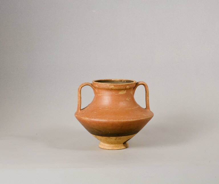 Corpo ceramico beige; vernice rosso-arancio e bruna, vernice nera all'interno.\nLabbro a disco a profilo convesso; spalla obliqua; corpo campanulato; piede a disco con carenatura; fondo rientrante ombelicato. Anse a nastro impostate sul labbro e sulla spalle.\nVerniciato in rosso, a risparmio piede e parte inferiore del corpo; tra la vernice rossa e la parte a risparmio spessa linea nera, con colatura.