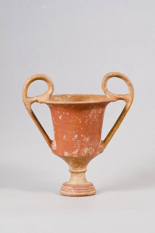 Corpo ceramico beige, ingobbio nocciola, vernice rossa-arancio.\nLabbro estroflesso, bocca rotonda, corpo cilindrico, alto piede su base troncoconica con modanature. Anse sormontanti impostate sull'orlo e sul corpo. Fondo con tre rientranze.
