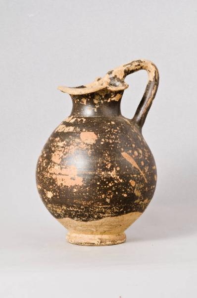 Corpo ceramico beige, vernice marrone, opaca, diluita con difetto di cottura. Piede e fondo a risparmio.\nOrlo ingrossatp, labbro estroflesso trilobato, collo a profilo concavo, corpo globoso, piede ad anello. Ansa a bastoncello, impostata verticalmente sull'orlo e sul corpo.