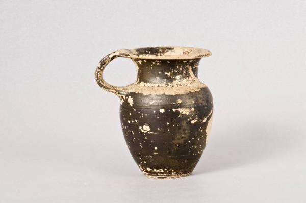 Corpo ceramico beige-giallo, vernice bruna opaca.\nlabbro estroflesso, collo a profilo a concavo, corpo ovoidale, fondo piatto. Ansa a nastro ad orecchio