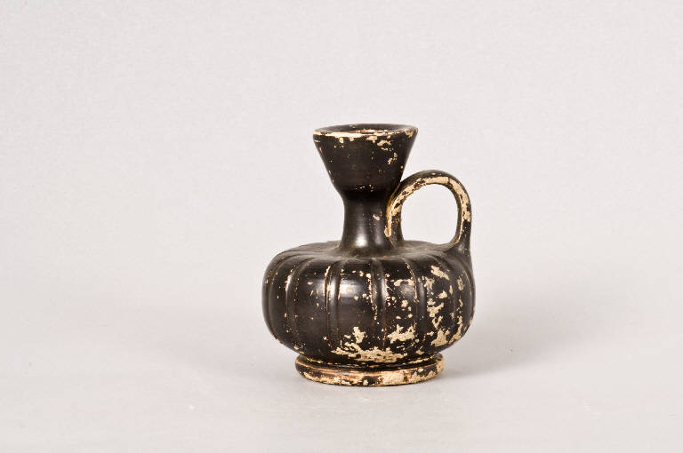 Corpo ceramico beige, ingobbio rossiccio; vernice nera olivastra abbastanza compatta, lucente. Bocchello verniciato anche all'interno.\nBocchello campanulato, collo tubolare, spalla orizzontale arrotondata, corpo lenticolare; piede ad anello, cavo, ombelicato. Ansa a nastro curvilinea impostata sul collo e sulla spalla. \nProfonde linee verticali sul corpo costituiscono la finta baccellatura.
