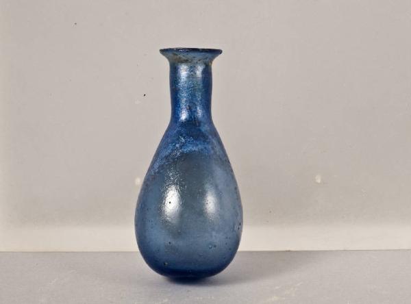 Vetro azzurro.\nLabbro estroflesso con orlo tagliato e arrotondato, collo cilindrico con strozzatura alla base, corpo piriforme, fondo piano apodo.