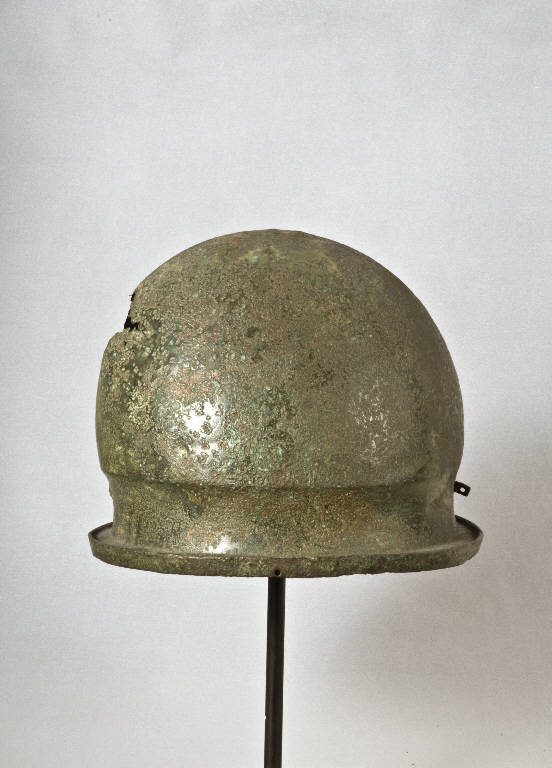 Elmo tipo Negau.\nCalotta ogivale con spigolo longitudinale, base ovale con golo pronunciata, breve tesa con bordo ripiegato verso il basso. Nella parte posteriore si conserva la laminetta forata per applicare la protome. Alla sommità restano tre dei quattro chiodi per fissare le piastrine. All'interno rimane la tesa, un tempo mobile, per applicare l'imbottitura al cuio.