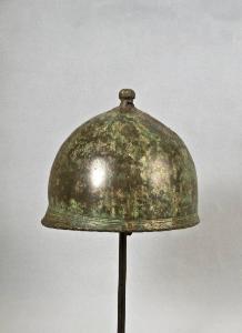 Elmo a calotta emisferica con bottone sommitale decorato da due palmette. \nParanuca con breve tesa decorata da scanalature: orlo ornato da file di perle e da cordone. \nAll'interno attacchi per le paragnatidi.