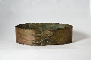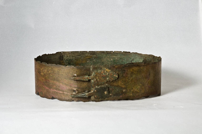 La lamina è profilata ai bordi da forellini per il fissaggio dell'imbottitura interna del cinturone. I due ganci di chiusura, fissati con quattro ribattini, sono costituiti da una doppia palmette, la più interna più piccola, racchiusa da due volute a s contrapposte.