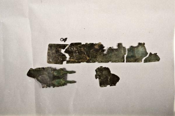 La lamina è profilata ai bordi da forellini per il fissaggio dell'imbottitura interna del cinturone, presenta ad entrambe le estremità ganci di chiusura a forma di palmetta di stile differente: si tratta con ogni probabilità di un rimontaggio moderno di elementi non pertinenti.