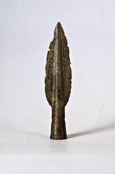 Cuspide a forma di foglia d'alloro, con costolatura mediana marcata e arrotondata, alette simmetriche. Immanicatura conica a cannone, nella parte mediana fori per fissaggio.