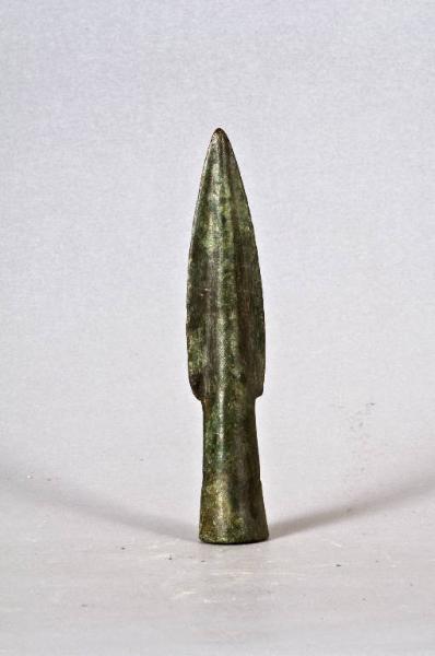 Cuspide con lama a foglia di alloro, costolatura mediana marcata a sezione arrotondata e alette; immanicatura a cannone con fori per fissaggio nella parte mediana.