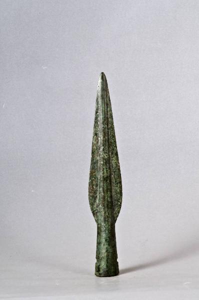 Lama a forma di foglia di salice con costolatura mediana rilevata; immanicatura a cannone circolare con fori per fissaggio nella parte terminale.