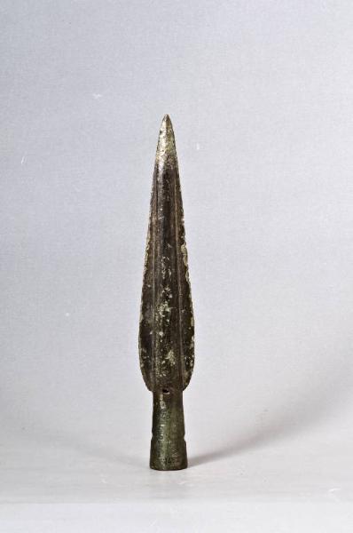 Lama a forma di foglia di salice con costolatura mediana marcata; immanicatura a cannone con fori per fissaggio nella parte mediana.