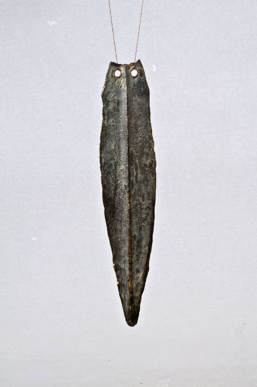 Lama di forma triangolare con larga costolatura mediana appiattita, bordi affilati, punta stondata. Alla base tre fori passanti per ribattini.