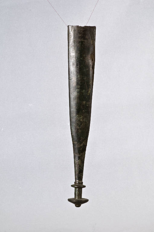 Fodero formato da due lamine, la più grande ribattuta sulla più piccola, terminante in un puntale composto da due anelli distanziati e sovrapposti. Su di una faccia tracce di motivo decorativo geometrico costituito da linee orizzontali.