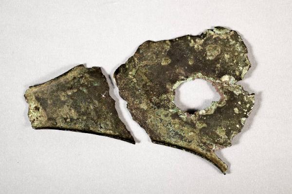 Elementi di pettorale di forma triangolare trilobata composta da tre frammenti con nn. d'inventario 2463 (a-c), assemblati tra loro, e due con nn. d'inventario 2468 (a-b) uniti tra loro. cfr. 2463