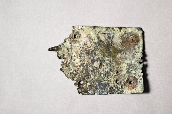 Lamina piatta con bordi rettilinei; quattro fori irregolari persso gli angoli.