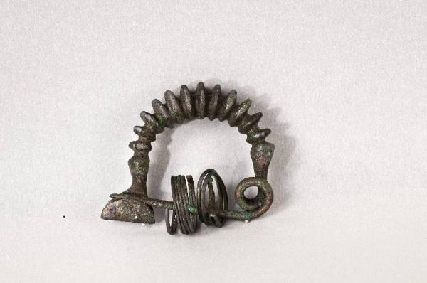 L'arco presenta grandi coste di tipo evoluto con staffa assimetrica; molla a doppio avvolgimento ad un solo lato. Nell'ago sono inserite due anelli a doppio filo di bronzo avvolto a spirale.