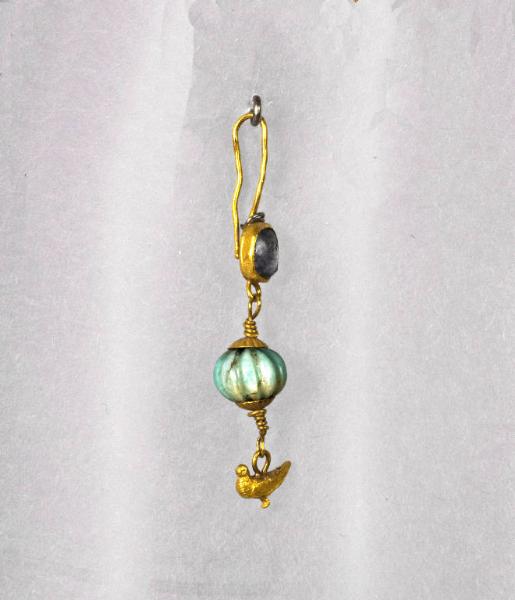 Orecchino pendente formato in succesione da castone ovale con zaffiro, sfera di avventurina verde con baccellatura a rilievo, colombina d'oro lavorata a sbalzo.