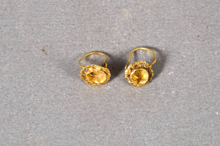 Orecchini con castoni rotondi privi della pietra, circondati da un motivo di palmette accostate. Ardiglione ad arco.