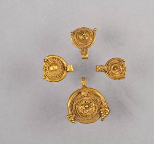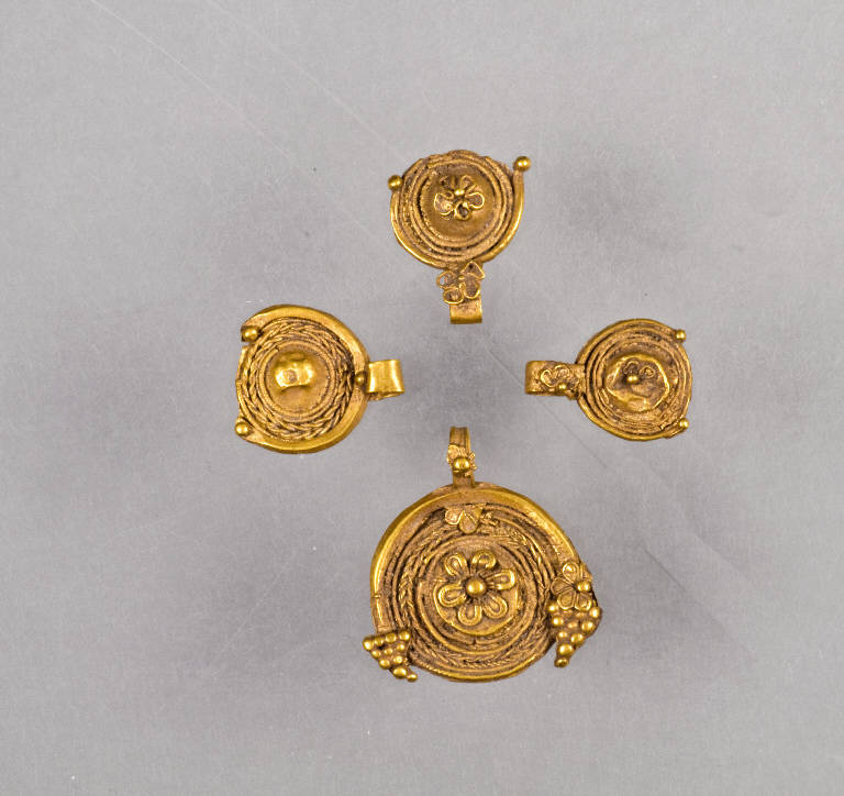 Quattro pendenti di forma circolare terminanti con un anello passante a nastro decorato con una rosetta. I pendenti sono decorati a filigrana con motivi vegetali: il disco più grande presenta cerchi concentrici in filigrana e fiore centrale a sei petali; nella parte superiore il bordo è decorato con una fascia terminante con grappoli d'uva. i due pendenti più piccoli presentano fiore centrale a cinque petali e bordo terminante con sferette.