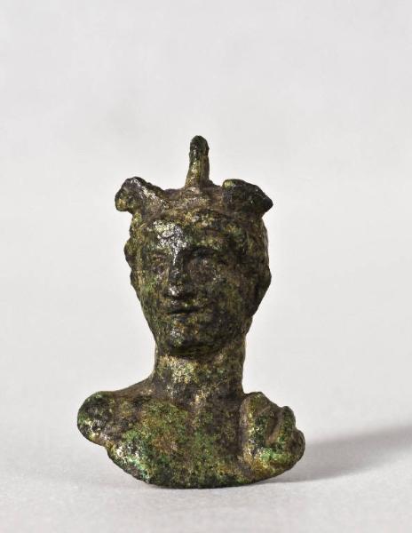 Busto di Mercurio.\nHa volto di tre quarti con caratteri appena accennati; sulla testa porta il petaso e sulle spalle oblique è raffigurato un lembo del mantello.\nSull'estremità superiore della testa è presente un anello per sospensione.