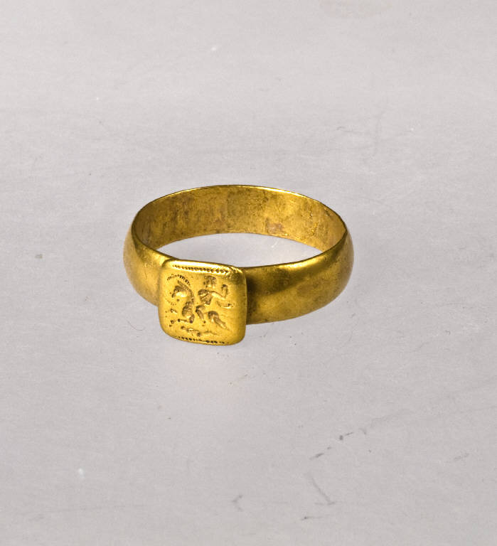 Verga a nastro leggermente convessa verso l'interno; il castone è una spessa piastra d'oro di forma quadrata .