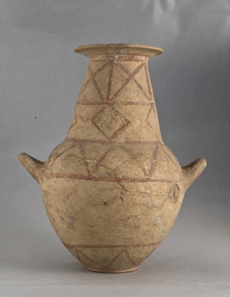 Corpo ceramico beige chiaro con inclusi di medie dimensioni, ingobbiatura beige, decorazione a vernice rossa.\n\nLabbro estroflesso, alto collo troncoconico che si allarga alla confluenza con la spalla, corpo globoso, piede a disco. Anse a bastoncello, arrotondate, impostate orizzontalmente sul corpo, rivolte verso l'alto.
