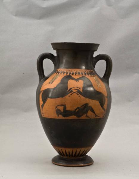 - NOTIZIE STORICO CRITICHE L'anfora faceva parte del nucleo originario della collezione del conte Gian Giacomo Poldi Pezzoli, fondatore del Museo. Di argilla rosata è dipinta con vernice nera. La decorazione principale del vaso rappresenta due cavalli di profilo che si affrontano e, in basso, un guerriero caduto a terra. Il riquadro è limitato nella parte superiore da una fila di boccioli di loto pendenti, collegati da archetti intrecciati. Sull¿altro lato appare una quadriga vista di fronte, con l¿auriga in piedi al centro. Sopra il riquadro, è rappresentata una catena di palmette alternate a foglie L'anfora è stata ricomposta da alcuni frammenti e presenta qualche scheggiatura, ma nell'insieme, per la qualità della decorazione e per lo stato di conservazione, si può considerare uno dei pezzi migliori della collezione archeologica. E' assegnata al Pittore dell'Altalena, ceramografo attico a figure nere attivo poco prima della metà e nel terzo quarto del VI sec. a. C. All'autore, il cui nome deriva dall'altalena su cui si culla una fanciulla in una scena dipinta sull'anfora di Boston, Museum of Fine Arts, n. 98.918, sono assegnati oltre cento vasi, nella massima parte anfore.