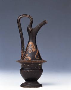 Corpo ceramico rosato, vernice nera lucente, ingobbiatura rosa-arancio. Sovraddipinture in bianco-giallo.\nBocca ad imbuto, collo troncoconico, spalle orizzontali, corpo ovoidale rastremato verso il basso con scanalature regolari; piede campanulato con modanature e risega all'attacco. Ansa a nastro sormontante impostata sul corpo e sul labbro. All'attacco dell'anse testine plastiche da matrice stanca.