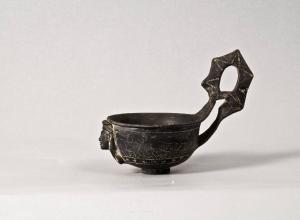 Corpo ceramico grigio, vernice nero-grigia.\nVasca emisferica con orlo estroflesso, piede a disco, rientrante al centro con ombelico. Anse sormontante con ponticello di rinforzo. Applique a testa femminile posta sulla vasca.
