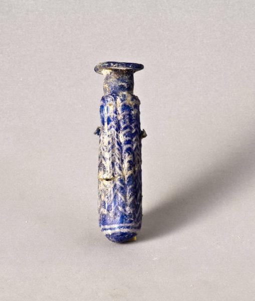 Vetro pressato su nucleo friabile di colore blu.\nOrlo orizzontale, collo cilindrico, corpo allungato, arrotondato all'estremità. Conservate parte delle due anse a presa nella parte superiore del corpo.