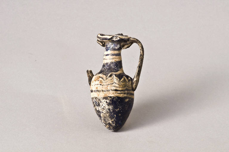 Vetro pressato su nucleo friabile di colore blu.\nLabbro orizzontale, collo cilindrico, corpo ovoidale. Anse a nastro agli attacchi e a bastoncello nella parte centrale, impostate sul labbro e sul corpo.