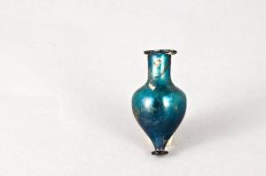 Vetro di colore turchese con striature.\nOrlo espanso arrotondato, collo cilindrico, breve spalla arrotondata, corpo piriforme terminante con peduncolo formato da disco piatto.
