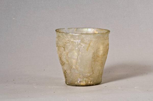 Vetro di colore verde.\nOrlo estroflesso ingrossato; corpo troncoconico con quattro leggere depressioni, fondo cavo.\nFilamento orizzontale applicato sotto l'orlo.