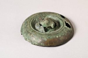 Placca circolare con fascia esterna convessa e parte centrale concava: al centro testa di ariete.