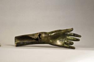 Avambraccio sinistro di statua femminile.\nHa mani affusolate con unghie indicate realisticamente atteggiate in movimento; l'anulare piegato porta un anello. Un altro anello decora la terza falange dell'indice.