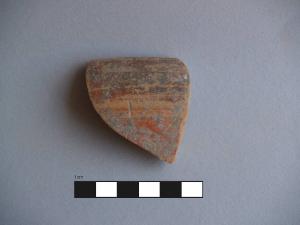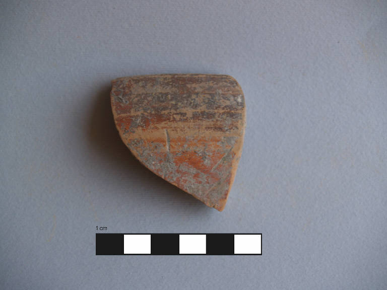 Orlo+parete di ciotola. \nOrlo arrotondato, labbro leggermente svasato a profilo rettilineo, carena arrotondata, attacco di vasca troncoconica.\nCorpo ceramico poco compatto, con superficie farinosa, con depurazione buona, assenza di inclusi. Colore nucleo: giallo-rosato; sup. esterna: una banda dipinta di colore rosso-bruno sul labbro e di colore rosso sulla parete; sup. interna: dipinta di rosso.