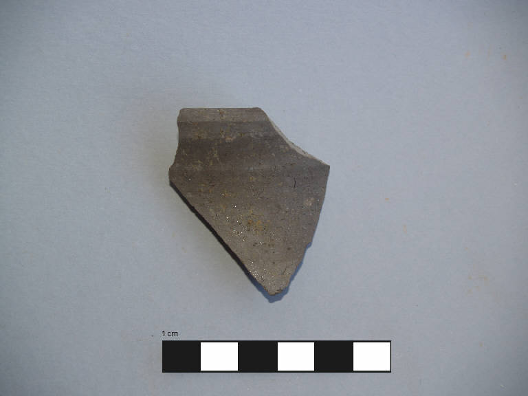 Orlo+parete di olla. \nOrlo piatto, obliquo verso l'esterno, labbro estroflesso, collo concavo, spalla sfuggente, corpo ovoide.\nCorpo ceramico molto compatto, con superficie esterna particolarmente liscia e compatta, con depurazione buona, con numerosi inclusi micacei di piccole dimensioni affioranti anche in superficie. Colore nucleo: grigio scuro; sup. esterna: grigio scuro; sup. interna: grigio scuro.\nProbabilmente pertinente al frammento 166/93 - St 160781.